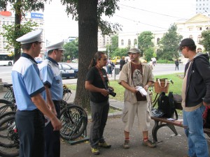 Am fost ieri la Patrula Velo, în Piaţa Victoriei alături de Geo Culda (preşedintele Asociaţiei Bate Şaua), Adam (interfaţa dintre Bate Şaua şi Brigada de Poliţie Rutieră), velobella Oana, Alex Burlacu şi Silviu. Ni s-au alăturat şi 2 agenţi ai Poliţiei Rutiere. Preţ de jumătate de ceas am stat de vorbă cu şoferii, le-am împărţit pliante cu extras din codul rutier şi am avut prilejul de a constata pe de o parte interesul unor şoferi şi lejeritatea cu care au abordat discuţia, pe de altă parte fixismul unora, crisparea.